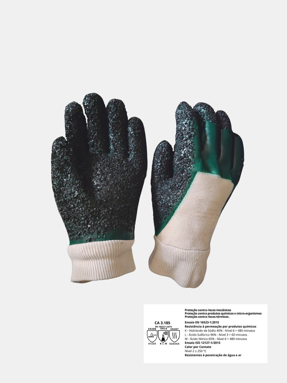Protective glove with cotton knit cuff, textile support in twisted knit yarn, 100% anti-allergic cotton, external PVC coating in green and palm region and fingertips with anti-slip properties through black granules of nitrile substances for better grip on larger, damp or oily objects, also allowing the handling of vibrating equipment in which there is vibration.